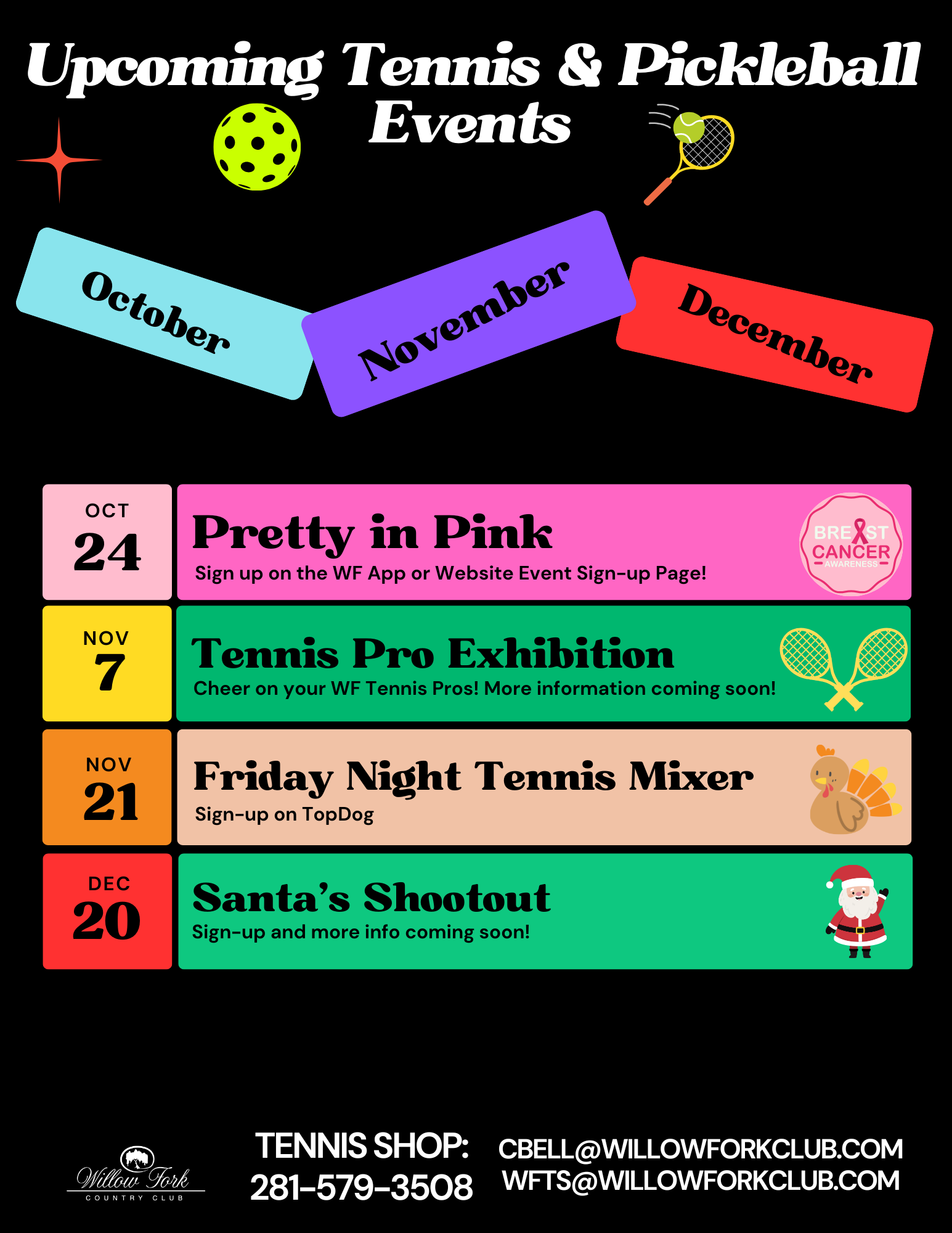 - Courts may be reserved up to 1 week in advance via the TopDog Booking System or by calling the Tennis Shop at 281-579-3508.